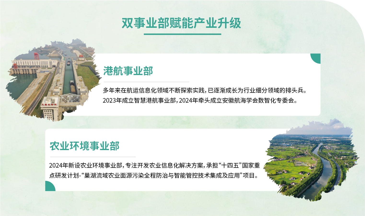 在航運(yùn)領(lǐng)域,不斷探索實(shí)踐,已逐漸成長為行業(yè)細(xì)分領(lǐng)域的排頭兵。2023年成立智慧港航事業(yè)部,2024年?duì)款^成立安徽航海學(xué)會數(shù)智化專委會。在農(nóng)業(yè)領(lǐng)域,專注農(nóng)業(yè)信息化解決方案的開發(fā)與落地。2024年新設(shè)農(nóng)業(yè)環(huán)境事業(yè)部,承擔(dān)了“十四五”國家重點(diǎn)研發(fā)計(jì)劃——“巢湖流域農(nóng)業(yè)面源污染全程防治與智能管控技術(shù)集成及應(yīng)用”項(xiàng)目。