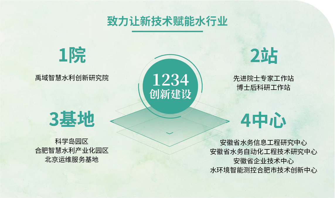 搭建1234創(chuàng)新平臺建設(shè),高度重視創(chuàng)新型人才引進(jìn)、培養(yǎng)機(jī)制,被評為“安徽省創(chuàng)新型企業(yè)”“安徽省科技創(chuàng)新貢獻(xiàn)獎(jiǎng)”“安徽省大數(shù)據(jù)企業(yè)”等。建有院士專家工作站、博士后科研工作站、安徽省企業(yè)技術(shù)中心、安徽省水務(wù)自動化工程技術(shù)研究中心等多個(gè)省市創(chuàng)新平臺,擁有專業(yè)的產(chǎn)品研發(fā)團(tuán)隊(duì)。